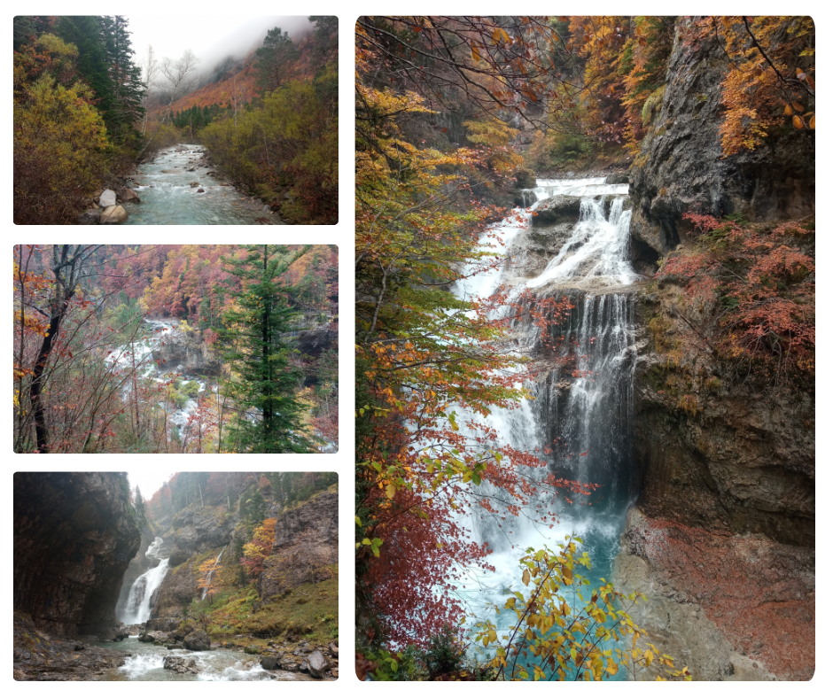 Después de una hora de ruta, llegamos a una zona más despejada, donde el camino se estrecha y transcurre a la derecha de la ladera de las montañas del valle y a la izquierda del río Arazas. Aquí, encontramos la cuarta parada del recorrido: las Gradas de Soaso; una escalinata de pequeñas cascadas que se deslizan por la montaña a diferentes niveles.